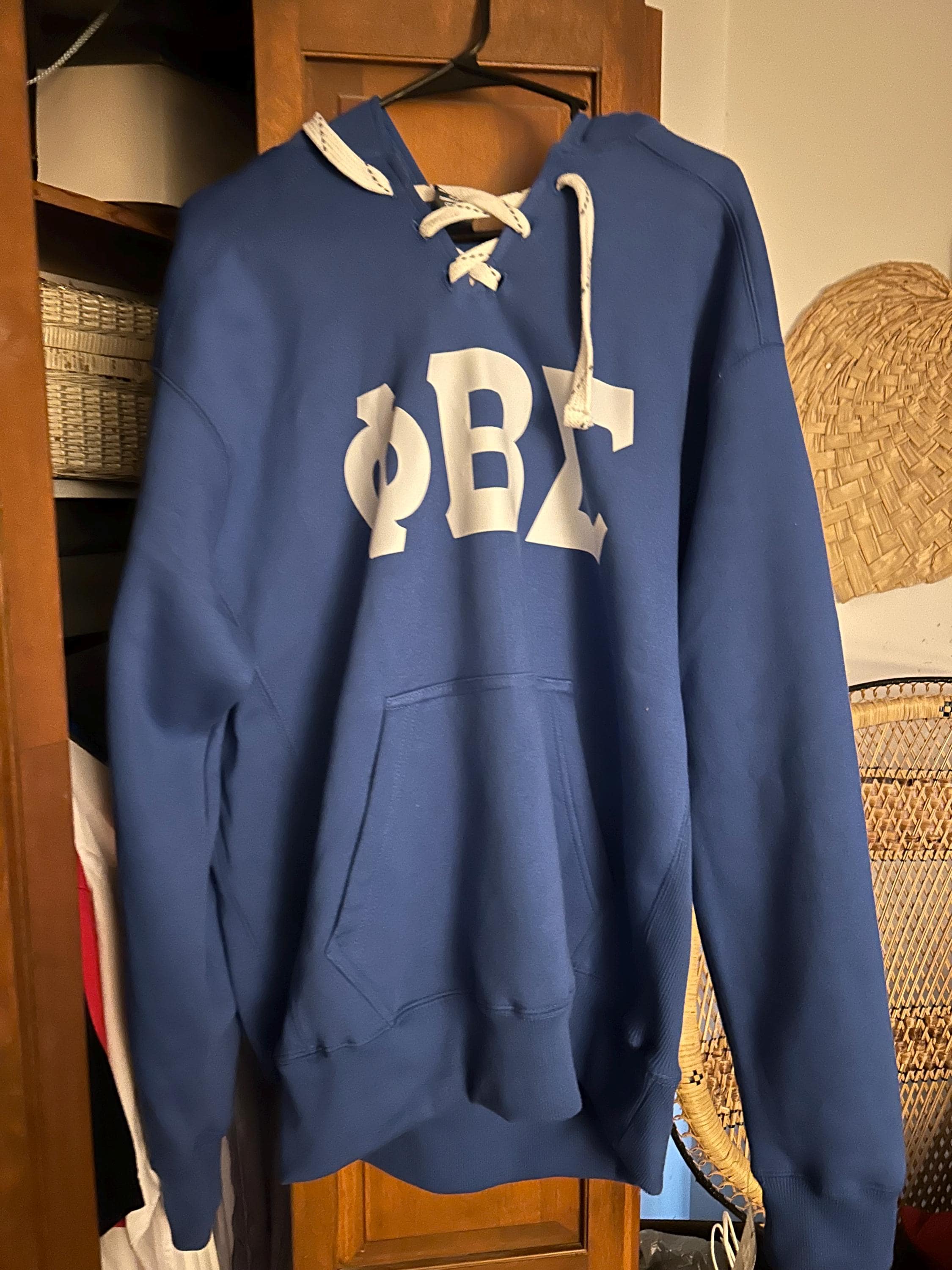 Phi Beta Sigma hooded sweatshirt. Hoodie has a shoe string lace up on the front neck. The shirt is 80% cotton 20% polyester. There are 4" white vinyl letters on the front chest. Very comfortable and heavy weight hoodie. Royal shirt has white letters and all other shirts have royal blue letters.