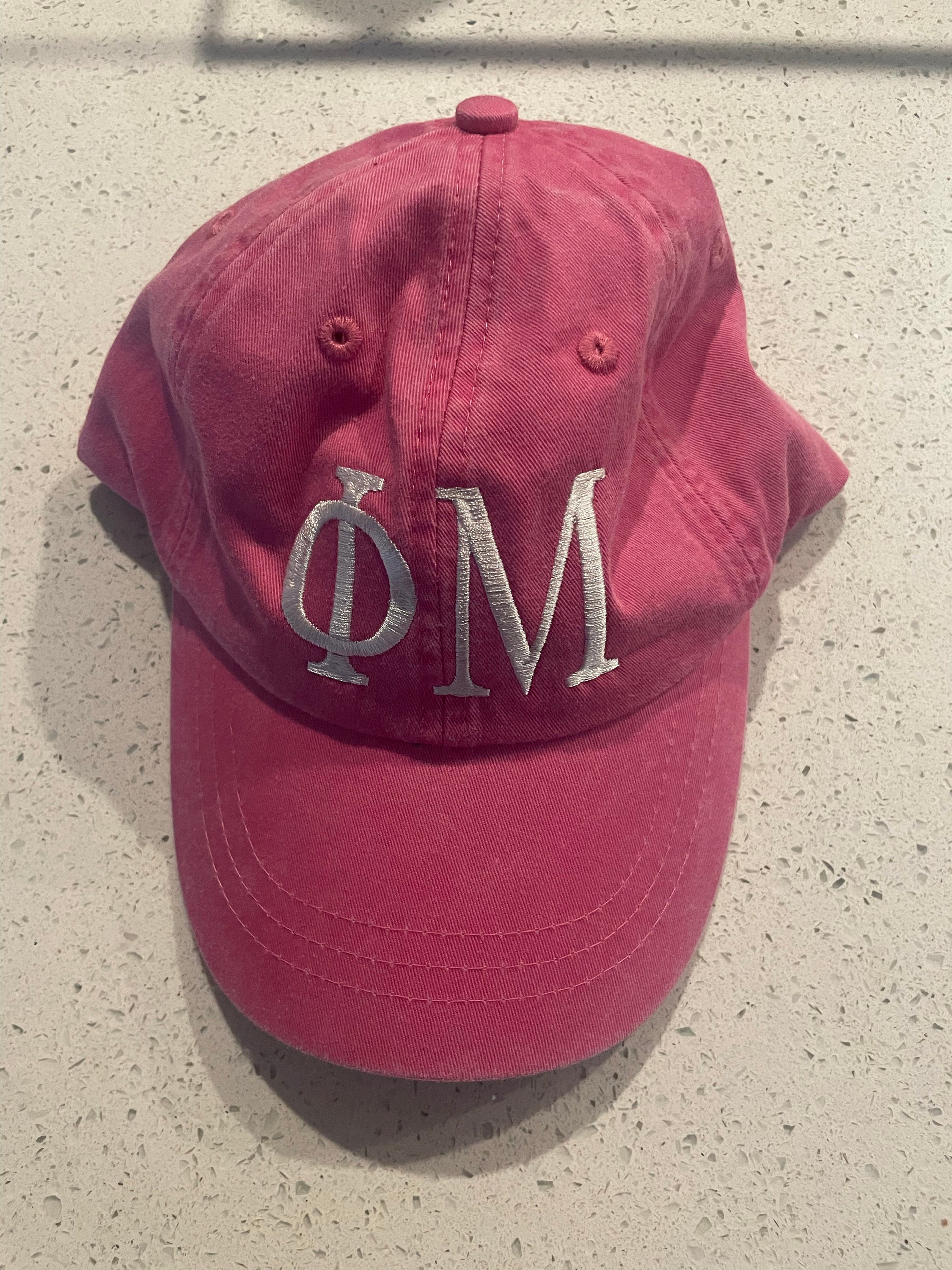 Pictured is a pink cap with white embroidered greek lettering. Also available are white, charcoal, coral, black, mint, chamois, and red caps with choice of black, pink, ivory embroidery.