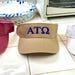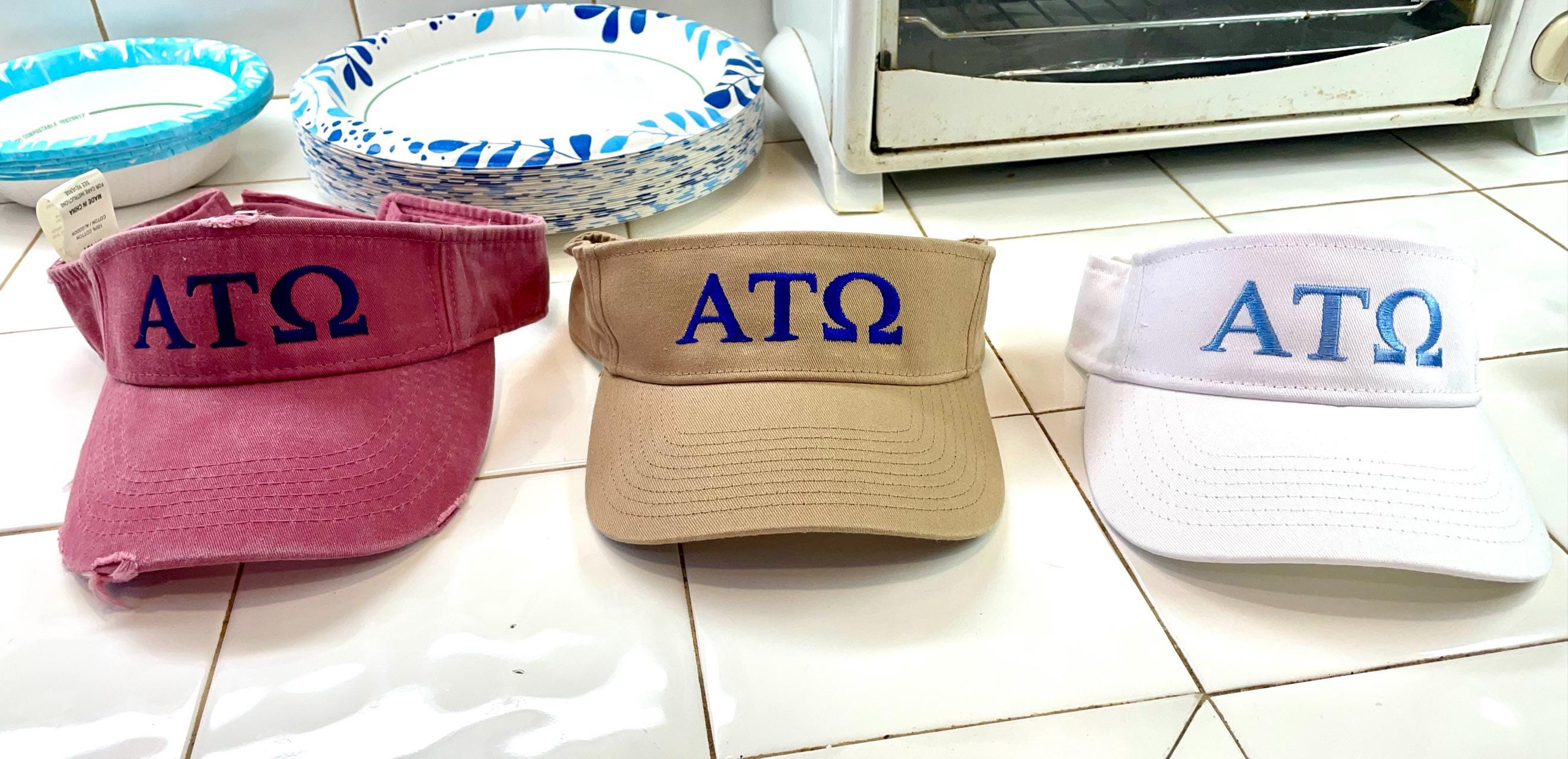 3 panel tan visor with embroidered greek lettering. Adjustable velcro strap on back. Color of visor and embroidery can be changed.
