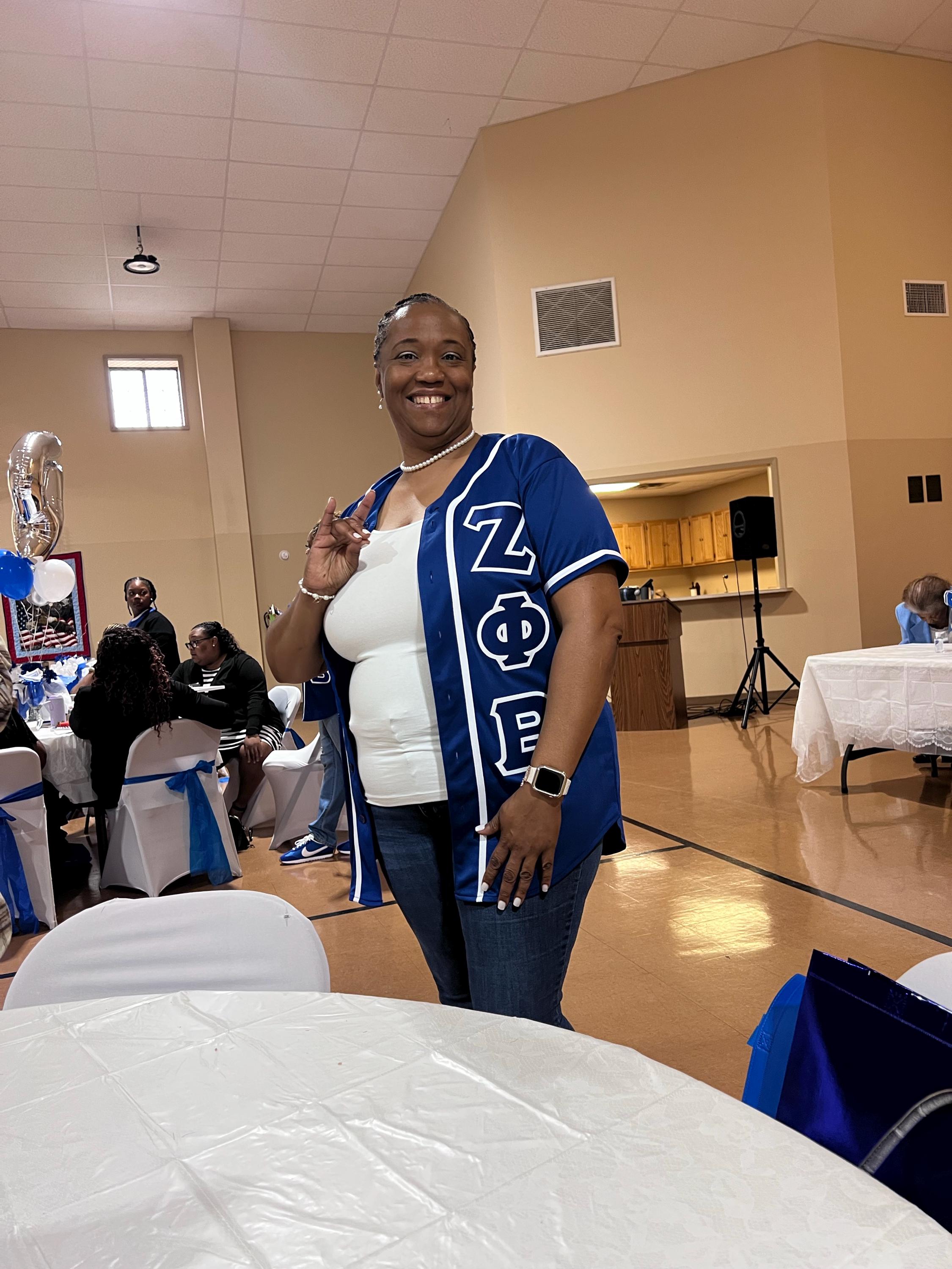 This is a great quality must have sorority jersey. Each jersey is royal blue with white strips and has royal with white 4" twill greek lettering down the left side. The letters have a faux stitch on them, meaning they appear to be sewn on but are not. Even though the letters are not sewn on they will not come off. The jersey is oversized.
